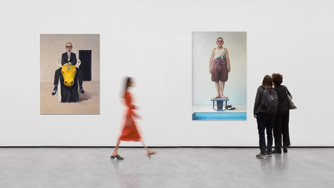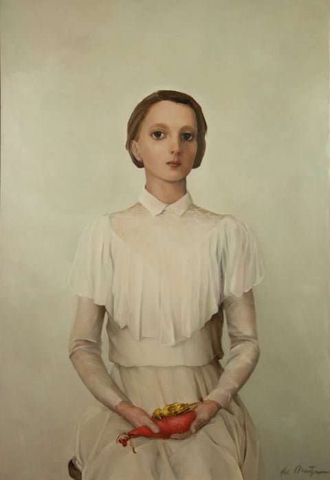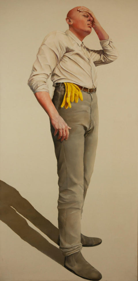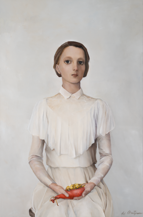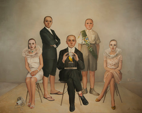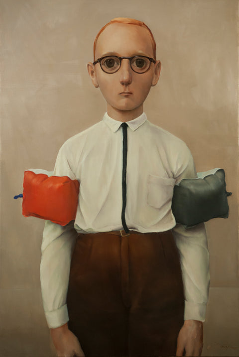 De Meijer's characters seem to live at the pinnacle of this imaginary perfect world, yet their aloof melancholic appearances show the emptiness and unhappiness of their existence. She surrounds her protagonists with absurd power status signifier objects to enhance the irony and sarcasm of the works."
