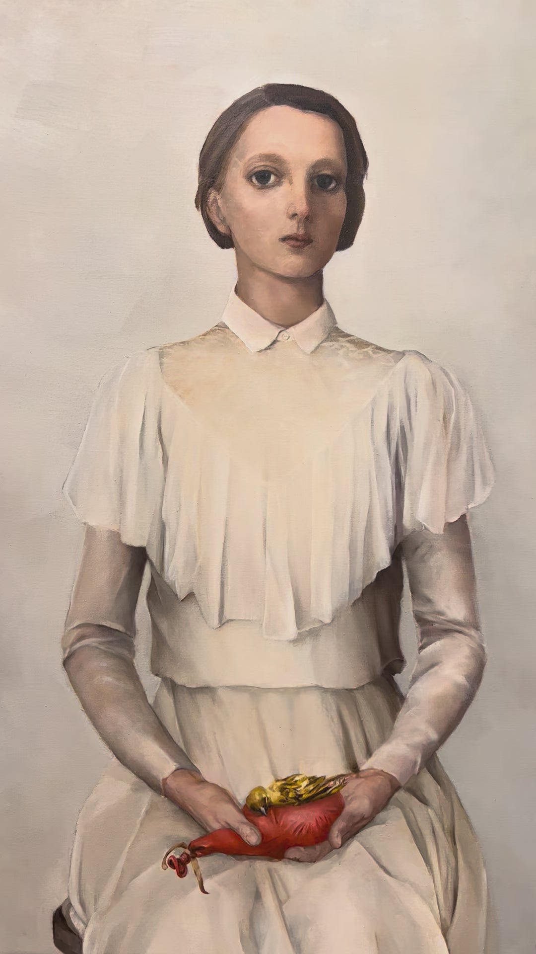 Her finely woven dress, rendered in pale tonalities, recalls the brittle luminosity of Arctic landscapes. The fabric’s intricacy contrasts with the inert weight of the bird, underscoring the tension between fragility and loss. Plastic — lightweight, synthetic, persistent — becomes an emblem of modern excess and environmental displacement.