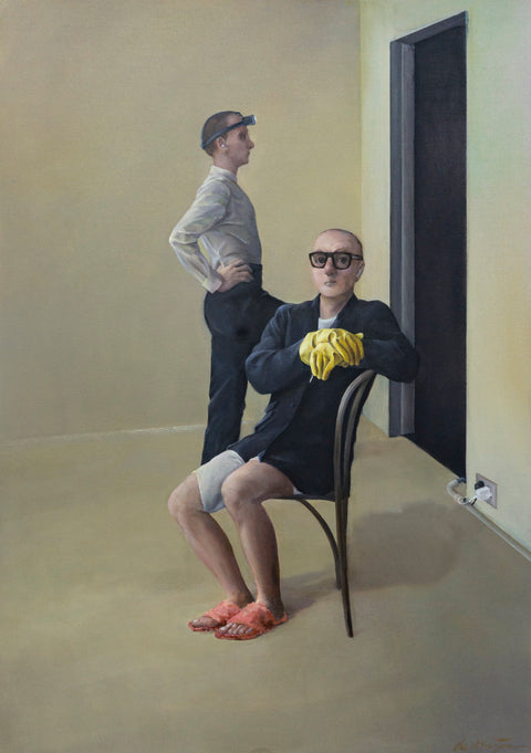 What we see. This work is about lobbying. We see two men giving a medal to each other. They look alike. In clothing and appearance. They are almost twins, they even share a set of Airpods. They look up as they were caught in the act.